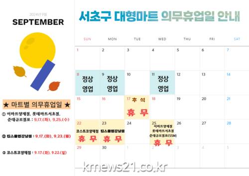 먼저 서초구 대형마트는 가족 먹거리와 선물 등을 준비하는 데 불편이 없도록 추석 전주인 9월 둘째 주에 쉬는 날 없이 운영한다. 기존의 월별 2‧4주 마트별 지정 휴무일을 이번달에는 2주차 대신 추석 당일로 변경해 쉬기로 한 것이다.