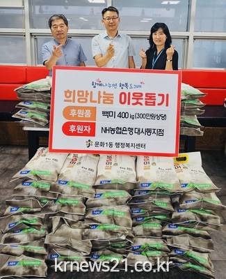 대전 중구 문화1동(동장 장성임)은 NH농협은행 대사동지점(지점장 박성규)에서 추석을 맞아 백미 400kg(300만 원 상당)을 문화1동 지역사회보장협의체(위원장 황광서)에 기탁했다고 5일 밝혔다.