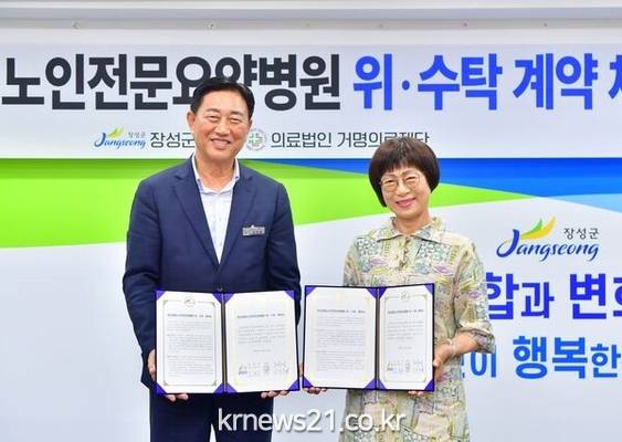 장성군이 6일 군청 상황실에서 의료법인 거명의료재단과 장성공립노인전문요양병원 위‧수탁 계약을 체결했다. 김한종 장성군수, 김경옥 거명의료재단 이사장 등 관계자들이 참석한 가운데 △병원 운영 및 시설 관리 위탁 △중대재해 예방 △노동약정 이행 등의 내용에 서명했다. 계약기간은 2029년 8월 31일까지 5년이다.