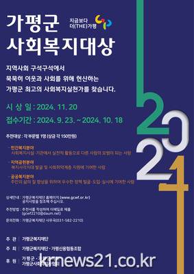 가평군복지재단과 가평신용협동조합은 10월 18일까지 ‘2024년 가평군사회복지대상’ 수상 후보자 접수를 받는다.