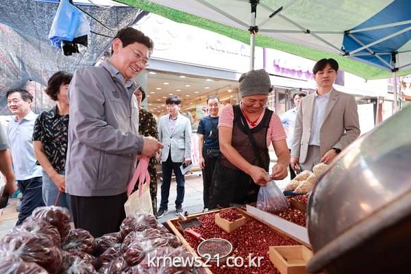 이 시장은 땅콩, 강정, 표고버섯, 참‧들기름, 깨, 떡, 과일, 전, 닭강정 등을 구입했다. 장을 보며 만나는 상인들과 시민들에게는 일일이 “추석 명절 다복하고 즐겁게 보내시길 바란다”며 인사를 하고 상인들의 애로사항도 들었다.
