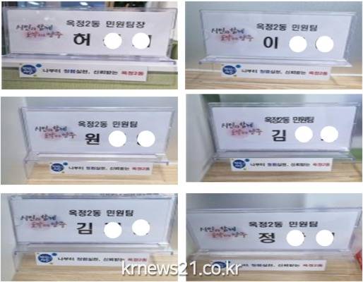 이날 민원실 직원들은 명패에 ‘나부터 청렴실천, 신뢰받는 옥정2동’이라는 청렴 슬로건을 부착해 스스로 청렴의식을 고취하고, 민원인들에게 청렴에 대한 신뢰감을 심어줄 수 있도록 했다.