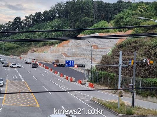 시는 이 문제를 해소하기 위해 13억원의 사업비를 투입해 지난 3월부터 U턴 차로 옆 시유지의 경사면을 깎아내는 방식으로 이곳 도로 93.1m 구간의 폭을 종전 10m에서 20.75m로 넓혀 U턴 차로 회전반경을 대폭 확대했다.