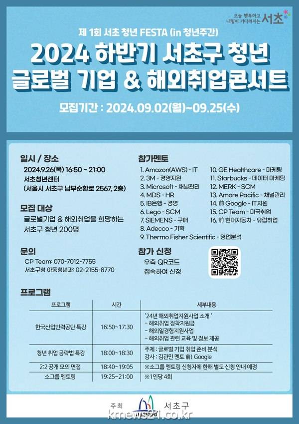전성수 서초구청장은 “서초 청년주간을 맞이해 청년들이 행복할 수 있는 다양한 프로그램들을 마련했다.”면서 “전시회를 통해 예술인으로서의 꿈을 펼치고, 경제나 취업 등 관심있는 분야에서 정보도 얻으며 의미있는 시간을 보내길 바란다.”고 말했다.