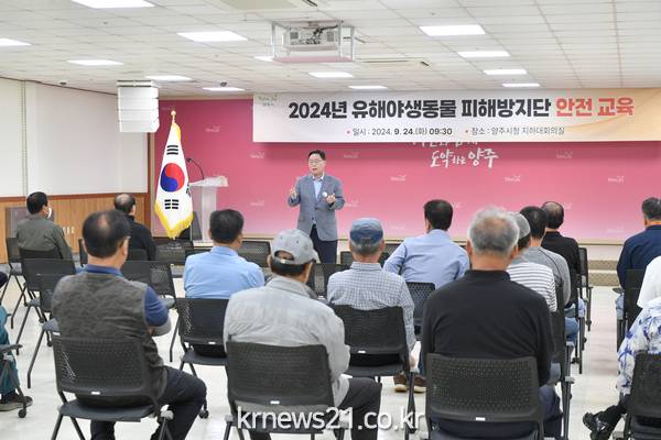 강수현 양주시장이 24일 오전 시청 지하 대회의실에서 야생생물관리협회가 주관한 ‘2024년 유해야생동물 피해방지단 안전교육’ 현장에 참석해 관계자들의 노고를 격려했다.
