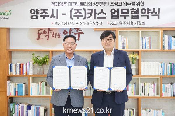 강수현 양주시장이 24일 오전 시청 2층 시장실에서 ‘㈜카스(대표 김태인)’의 ‘경기양주 테크노밸리(이하 양주테크노밸리)’ 입주 및 상호협력을 위한 업무협약을 체결했다.