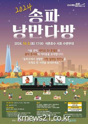 송파구(구청장 서강석)는 오는 5일 17시부터 석촌호수 서호 수변무대에서 가족 페스티벌 ‘2024 송파낭만다방’을 개최한다고 밝혔다.