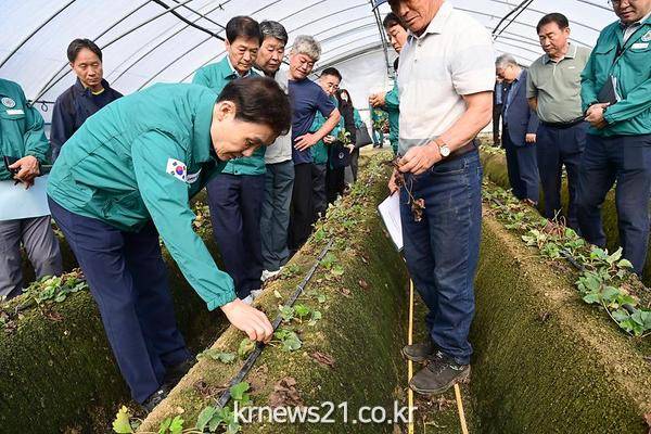 고령군(군수 이남철)은 10월 1일(화) 고온 피해로 농작물 재배에 어려움을 겪고 있는 개진면 딸기 농가, 감자 농가에 군수, 군의회, 도의원, 농협 등 관련 행정기관이 함께 방문하여 피해 현황 파악 및 농가의 애로사항을 청취하였다.