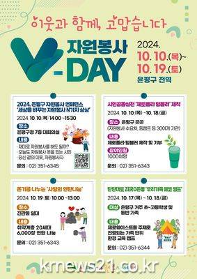 은평구(구청장 김미경)는 오는 10일부터 19일까지 ‘자원봉사 V-day’를 개최할 예정이다.