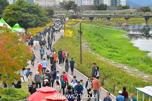 ‘장성 황룡강 가을꽃축제’가 열리고 있는 황룡강변이 백일홍, 코스모스 등 가을꽃으로 알록달록 물들었다. 황룡강을 찾은 사람들이 저마다 기념사진을 남기거나 꽃길을 걸으며 가을 풍경을 만끽하고 있다.