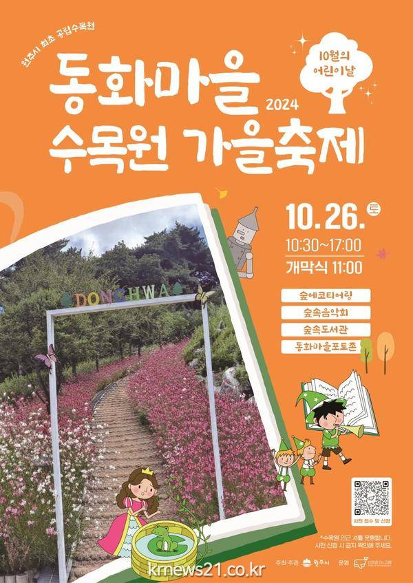 □ 올해로 2회를 맞는 ‘동화마을수목원 가을축제’는 수목원의 핵심 테마인 ‘동화’를 주제로 숲 에코티어링, 목공·원예·수목원 체험과 동화 OX퀴즈, 댄스타임 등 다채로운 행사가 진행된다.□ 이외에도 원주 출신 청년 아티스트 3인이 동요와 애니메이션 ‘겨울왕국’의 OST 등을 연주하며 공연을 펼치는 ‘숲속 음악회’가 수목원 잔디광장에서 열릴 예정이다.□ 또한 캠핑 의자나 빈백에 앉아 음악을 들으며 책을 읽을 수 있는 ‘숲속 도서관’도 운영한다.□ 사전접수 및 신청은 홍보 포스터의 큐알(QR)코드를 통해 온라인으로 신청할 수 있으며, 당일 현장 접수도 가능하다.□ 시 관계자는 “이번 가을 동화마을수목원에서 가족 등과 함께 체험과 놀이, 휴식을 만끽하시길 바란다.”라며, “방문객 편의를 위해 축제 당일 수목원 인근 셔틀버스를 운행할 계획”이라고 전했다.