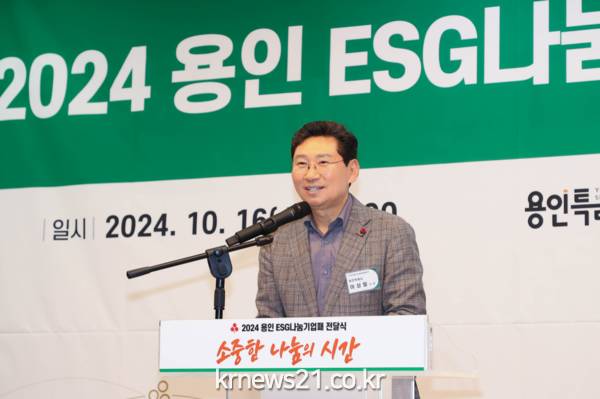 이 시장을 비롯한 3개 기관 대표는 이날 농협은행(주)용인시지부(지부장 박종복), 삼성물산(주)에버랜드리조트(대표 정해린) 등 33개 기업(법인)을 ‘용인 ESG나눔기업’으로 인증하고, 이 자리에 참석한 25개 기업에 인증패를 전달했다.