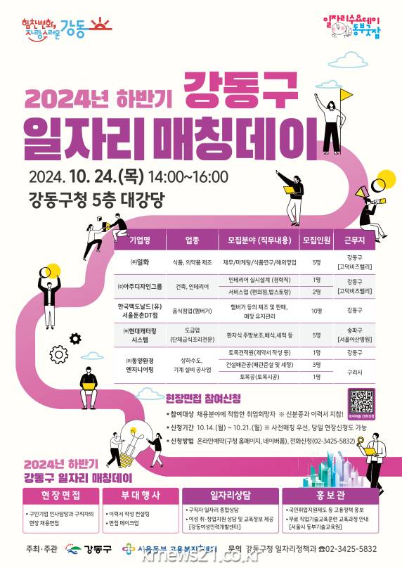 강동구(이수희 구청장)는 오는 24일, 강동구청 5층 대강당에서 2024년 하반기 ‘일자리 매칭데이’를 개최한다고 15일 밝혔다.