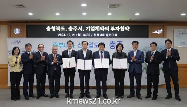 충청북도와 충주시는 21일 충주시청 3층 중회의실에서 ㈜에스앤에스 등 3개 사와 1,400억 원 규모의 투자협약을 체결했다.
