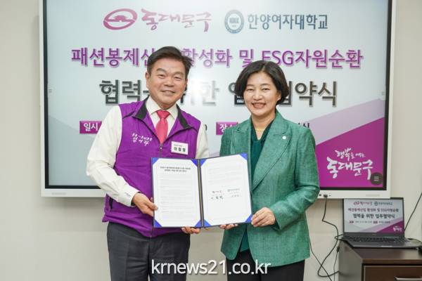 동대문구(구청장 이필형)는 10월 31일 한양여자대학교와 패션봉제산업 활성화 및 ESG 자원순환 협력체계 구축을 위한 협약을 체결했다.