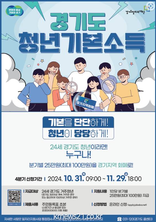 용인특례시(시장 이상일)는 11월 29일까지 ‘2024년 4분기 청년기본소득’ 지급 신청을 받는다.