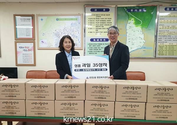 부산 동래구 온천2동(동장 이미경)은 지난달 22일 동래제일교회(담임목사 유종헌)로부터 어려운 이웃을 위한 사랑 나눔 과일상자 35박스를 전달받았다고 밝혔다.