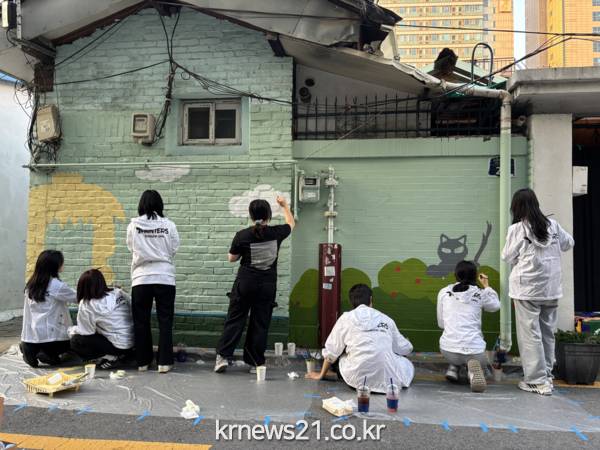 서울 동대문구(구청장 이필형)는 최근 동국대학교 봉사동아리 ‘페인터즈(회장 황채현)’와 함께 낡은 벽화를 새 단장해 도시미관을 개선했다고 5일 밝혔다.