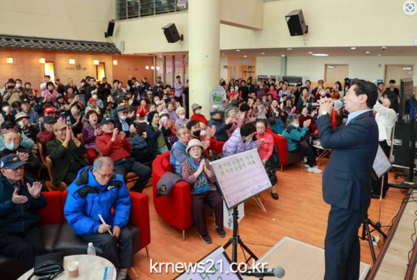이상일 시장은 약 300여명의 어르신이 모인 이 자리에서 가수 임영웅의 ‘별빛 같은 나의 사랑아’를 불러 박수갈채를 받았다. 이어 이 시장은 어르신들의 앙코르 요청에 가수 조영남의 ‘모란동백’을 부르며 한 자리에 모인 관객에게 의미 있는 시간을 선사했다.