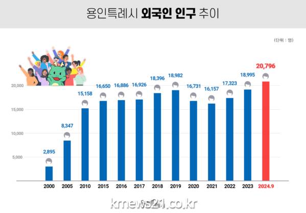 용인특례시의 외국인 주민이 사상 처음으로 2만 명 선을 돌파해 관심을 끌고 있다. 지난 5월 말 총인구가 110만 명 선을 넘어선 데 이어 등록 외국인도 꾸준히 증가 추세를 보이기 때문이다.
