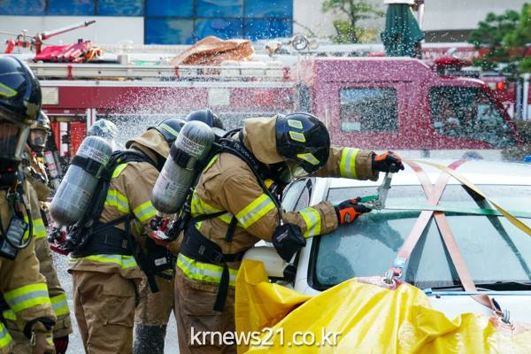 이번 훈련은 최근 전기차 열폭주로 인한 대형 화재 사례를 반영하여, 대형 병원에서의 화재와 유해가스 누출 등 복합재난 상황을 가정한 시나리오로 경희의료원에서 진행됐다.
