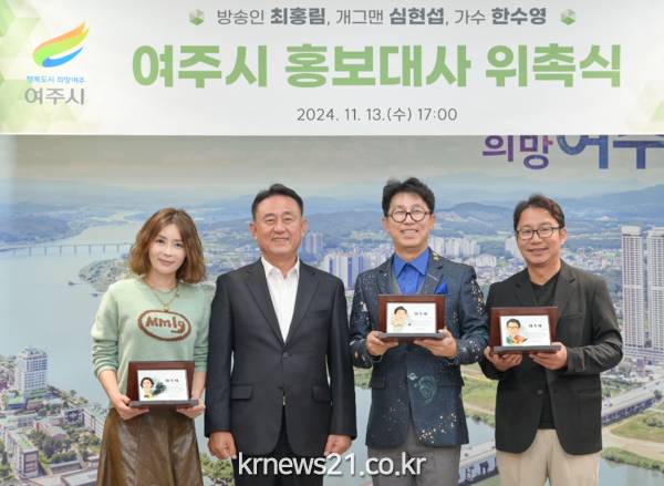여주시는 13일 시청 시장실에서 이충우 여주시장과 관련 국‧과장이 참석한 가운데 개그맨 심현섭, 방송인 최홍림, 싱어송라이터 한수영을 홍보대사로 위촉했다고 밝혔다.