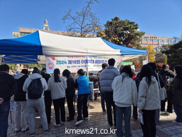동대문구(구청장 이필형)는 세계 아동학대 예방의 날을 맞아 지난 18일 경희대학교 청운관 앞마당에서 동대문구청, 동대문경찰서, 서울특별시 동부아동보호전문기관이 함께 아동학대 예방 캠페인을 진행했다고 밝혔다.
