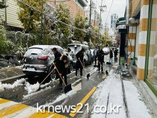 27일 서울에 내린 눈은 기상관측을 시작한 이래 117년 만에 11월 적설 최고치를 기록했다. 광진구에도 지난 이틀간 13.5센티미터의 눈이 쌓이며 제설대책 2단계를 가동하고 비상근무에 들어갔다.