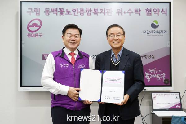 동대문구(구청장 이필형)는 11월 26일 구청장실에서 사회복지법인 대한사회복지회와 함께 구립 동백꽃노인종합복지관의 관리·운영에 관한 위·수탁 협약식을 가졌다.