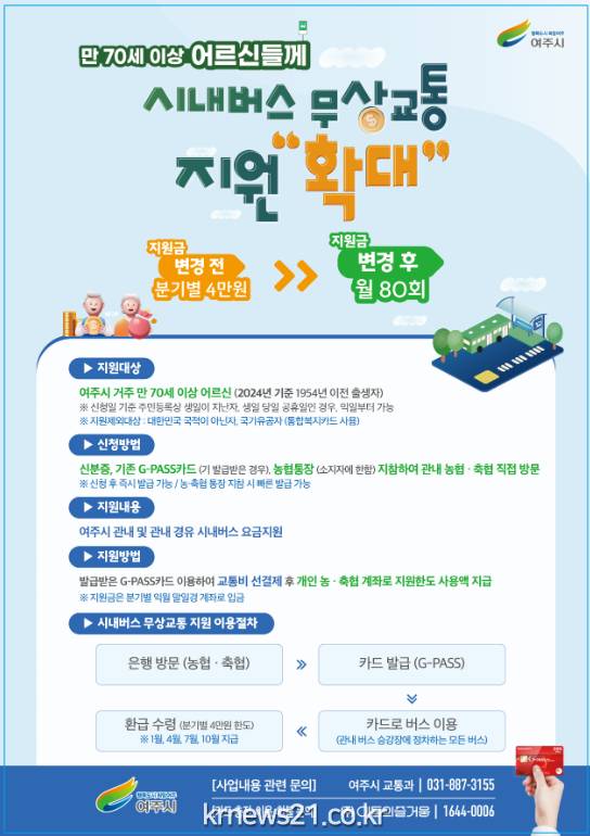 어르신 무상교통 카드는 여주시 관내 농·축협에서 신청 및 발급받을 수 있다. 이 카드를 이용하면 여주시 시내버스뿐만 아니라 관내를 경유하는 111번과 37번 시내버스에서도 혜택을 받을 수 있다.