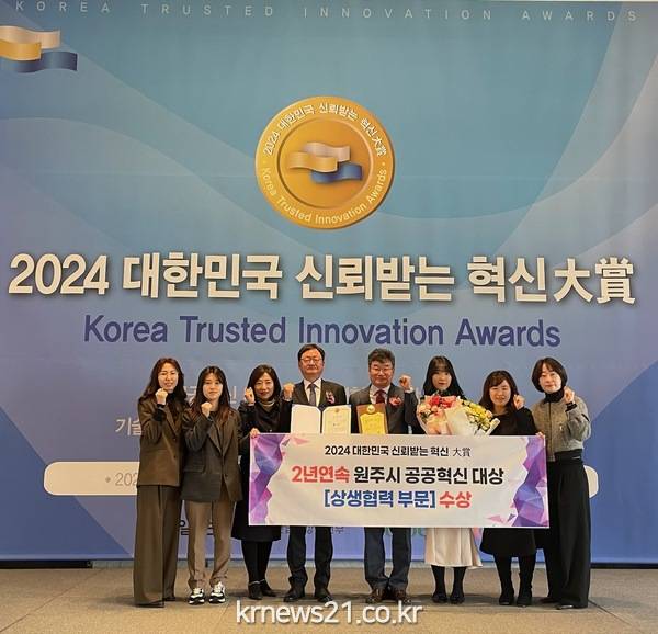 ▲ 사진=원주시 □ 원주시는 ‘2024년 대한민국 신뢰받는 혁신대상 시상식’에서 공공혁신·상생협력 분야에서 2년 연속 ‘대상’을 수상하는 쾌거를 이뤘다.