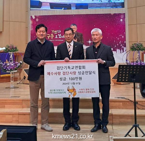 지난 1일 검단기독교연합회(회장 최계식)에서 관내 저소득층을 돕고자 성금 100만원을 검단동 지역사회보장협의체(동장 김명진, 위원장 문미경)에 기탁했다.