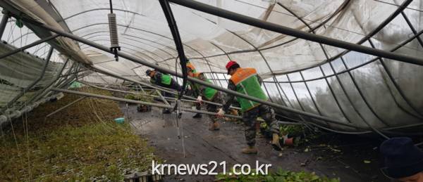 방재단은 무너진 비닐하우스 내부에서 구조물을 정리하고, 상품 가치가 있는 화분은 안전한 곳으로 옮기는 등 피해 수습과 동시에 약해진 비닐하우스를 보수하는 등 추가 붕괴 예방 작업도 병행했다.