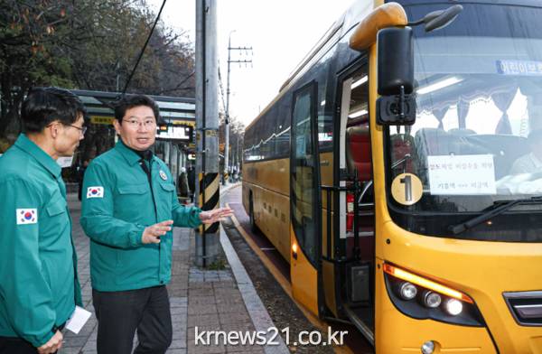 이 시장은 기흥역 광역 버스승강장에서 출근길 시민들과 인사하고, 대기 중이던 전세버스가 제때 출발하는지, 이용하는 시민은 얼마나 되는지 등을 살펴봤다.