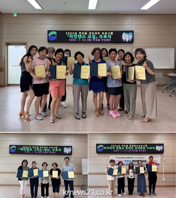 서구 부민동 주민자치 위원회(위원장 최태범)는 2024년 상반기 주민자치 프로그램으로 진행했던 『라인댄스』, 『색연필 그리기 교실』과 평생학습센터 사업으로 진행했던 『티키타카 원어민 영어 회화』 프로그램 수료식을 개최하였다.