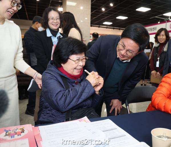 ▲ 사진=마포구박강수 마포구청장은 2024년 12월 10일(화) 오전, 마포구청 1층 어울림마당에서 열린 ‘2025년 마포구 노인 일자리 박람회’를 찾아 어르신들의 구직 고충을 청취하며 일자리 찾기를 안내했다.