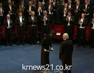 ▲ 사진=KBS NEWS 영상 캡처한강 작가는 평소 즐겨 입는 검은 색상의 차분한 디자인의 드레스를 입고 스웨덴 국왕 앞에 섰다.