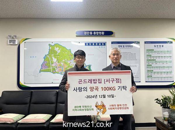 이에 김명진 검단동장은 “기탁받은 양곡은 따뜻한 마음을 담아 꼭 필요한 이웃들에게 전달하겠다”며 “이웃사랑을 실천해 주신 곤드레밥집에 감사의 말씀을 드린다”고 전했다.