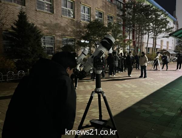 ▲ 사진=의정부시충의중학교는 12월 10일(화) 저녁,‘가족과 함께하는 별이 빛나는 밤’행사를 열었다. 우주의 아름다움을 체험하고 과학적 호기심을 자극하기 위해 열린 천체관측 행사에 학생과 학부모 30여명과 교직원들이 함께 참여하였다.