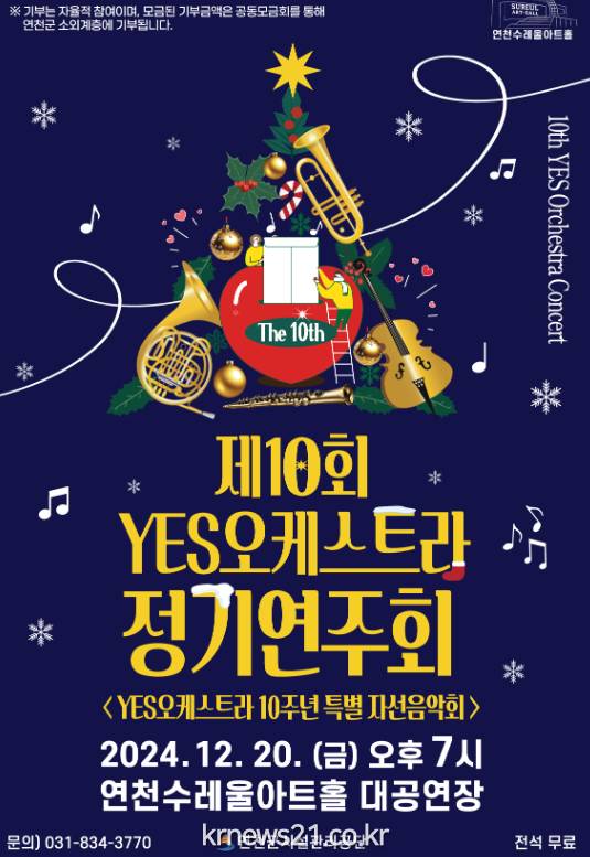 YES오케스트라는 지난 10년간 연천군 대표 오케스트라로 자리 잡으며 지역 문화예술 발전을 위해 다양한 활동을 펼쳐왔다. 이번 연주회는 그동안의 성과를 돌아보며 지역사회의 응원에 감사함을 전하고, 음악을 통해 나눔과 희망의 메시지를 전달하고자 한다. 연주 프로그램은 클래식 음악과 영화 OST 등 대중들에게 친숙한 곡들로 구성되어 있으며, 누구나 공감할 수 있는 다채로운 프로그램으로 선보일 예정이다.