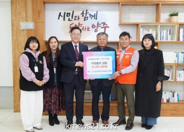 ▲ 사진=양주시양주시자원봉사센터(이사장 강수현)가 그린스톤산업주식회사(대표 조만형)와 지난 16일 이웃돕기 성금(1천만원) 기부식을 진행했다고 전했다.