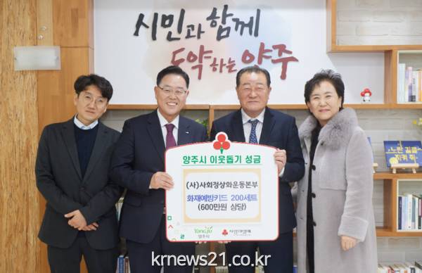 강수현 양주시장은 (사)사회정상화운동본부의 따뜻한 마음에 큰 감사를 전하며 “올겨울 한파가 예상되고 화재에 대한 우려가 커지는 시기에 이번 성품은 저소득 소외계층이 안전하게 생활하는데 큰 도움이 될 것이다”며, “화재에 취약한 가구에 이웃사랑의 마음을 담아 잘 전달하겠다”고 말했다.