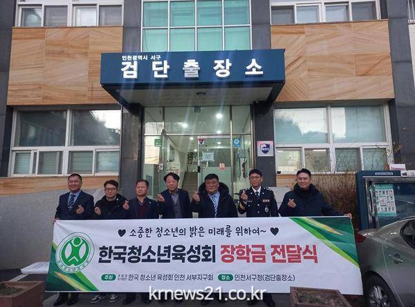 ▲ 사진=인천광역시 서구한국청소년육성회 서구지구(회장 장기선)는 12월 18일 검단 관내 저소득 가정의 중학생에게 지원하는 ‘사랑의 장학금’ 240만원을 검단출장소(출장소장 김재천)에 전달했다.