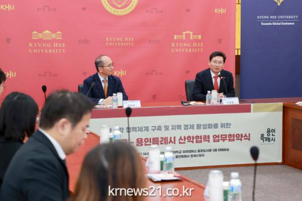 ▲ 사진=용인시용인특례시(시장 이상일)는 19일 기흥구 서천동 경희대학교 국제캠퍼스 대회의실에서 경희대학교와 ‘관-학 협력체계 구축 및 지역 경제 활성화를 위한 산학협력 업무협약’을 체결했다고 20일 밝혔다.