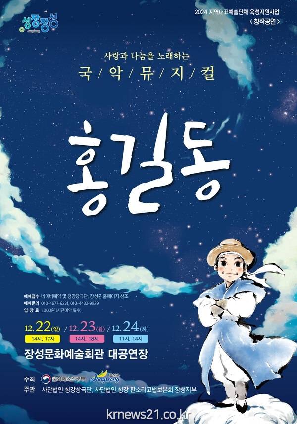 장성지역 예술단체 청강창극단이 선보이는 ‘홍길동’은 허균의 소설 ‘홍길동전’의 주인공 홍길동을 재해석해 색다른 재미를 선사한다. 국악과 뮤지컬을 접목한 형식도 신선하다.