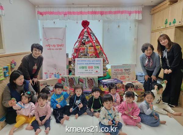 ▲ 사진=인천광역시 서구서구 청라3동 모아미래도아파트 입주자들과 국공립모아미래도어린이집(원장 김효진)은 지난 23일 크리스마스를 앞두고 어린이들과 지역주민이 함께 마련한 라면으로 ‘사랑의 라면트리’를 만들어 청라3동 행정복지센터(동장 고은선)에 기탁했다.