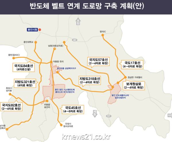 우선 중앙정부가 용인 첨단시스템반도체 국가산단의 원활한 조성을 위해 도로‧전력‧용수 등의 예비타당성 조사를 면제하면서 만성 정체를 빚던 국도 45호선(처인구 남동 대촌교차로~안성시 양성면 장서교차로, 12.5km)을 4차로에서 8차로로 확장하는 사업이 당초보다 3년 이상 앞당겨진 2030년 준공을 목표로 전액 국비로 진행된다.