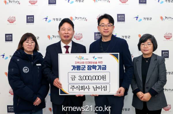 ㈜남이섬은 최근 가평군에 장학금 300만 원을 전달하며 지역인재 육성에 힘을 보탰다.