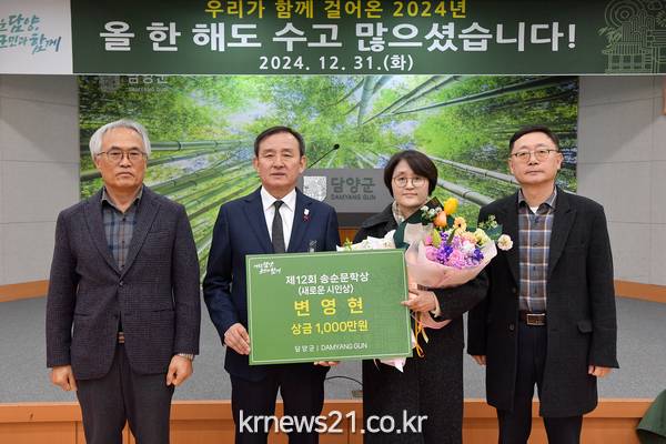 담양군(군수 이병노)은 면앙 송순 선생의 문학정신을 기리고 문학의 저변 확대를 위해 추진한 제12회 송순문학상 ‘새로운시인상’ 부문에 변영현 시인이 선정됐다고 2일 밝혔다.