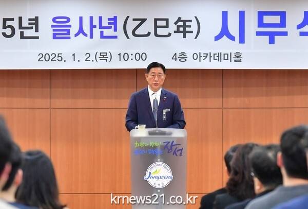 이날 김한종 군수는 “겨울 들판을 바라보는 농부의 마음으로 새해를 맞이한다”며 “겨울이 물러가고 봄이 오면 장성은 희망으로 가득할 것”이라고 전망했다.가장 주목되는 분야는 ‘관광’이다. 올해 장성군은 전남체전(4월 18~21일), 전남장애인체전(4월 30일~5월 2일)을 필두로 ‘장성 방문의 해’를 운영할 계획이다. 축령산 등산객 대상 무료 관광택시, 보물찾기, 구석구석 라이브 버스킹 등 다채로운 체감형 콘텐츠를 마련한다.김한종 군수는 “방문 편의성과 접근성을 높여 사계절 축제같은 도시를 만들겠다”고 말했다. 이어서 “세계유산 필암서원 콘텐츠 발굴, 장성호 제3출렁다리 설치, 황룡강 지방정원 조성 등 지속 가능한 관광산업 기반을 조성해 지역경제 성장의 기회를 창출하겠다”고 밝혔다.김 군수는 “역대 최다 방문이 예상되는 올해는 ‘1000만 관광시대’를 여는 효시가 될 것”이라며 “군민 여러분과 손잡고 새 역사를 써내려 가겠다”고 강조했다.성장동력 확보 분야에서는 428억 원 규모 농촌협약, 270억 원 규모 대창동 도시재생사업, 300억 원 규모 장성 원더랜드 프로젝트 추진을 통해 지역 균형발전의 초석을 다진다. 총사업비 769억 원이 확정된 국립심뇌혈관연구소 설립과 지방산업단지 신규 개발로 지역경제를 견인할 방침이다.미래 농업환경에도 적극적으로 대응한다. 군은 청년들에게 스마트농업 도전 기회를 제공하는 ‘스마트농업 육성지구 조성사업’을 추진할 계획이다. 2026년 완공되는 삼계면 국립아열대작물실증센터와 연계해 장성레몬 등 ‘K-아열대작물’의 경쟁력을 강화하고, 세계시장 개척에 나선다.김 군수는 “우리가 흘린 땀방울이 장성의 꿈을 영글게 할 단비가 될 것”이라며 “모두의 노력을 하나로 모아 2025년을 ‘기회와 성장의 해’로 만들겠다”고 말했다.환경과 안전분야 성장에도 힘쓴다. 황룡면 신규 소각시설 설치, 장성읍 청운지하차도 개설 등을 추진하고 황룡강을 ‘생명과 문화의 강’으로 재탄생시킬 방침이다. 편백숲으로 잘 알려진 축령산은 휴양림, 목재문화체험장 등을 조성해 ‘숲’과 ‘쉼’이 이어지는 공간으로 만든다.복지분야에선 군민 행복을 목표로 삼는다. 초‧중‧고등학교 입학 축하금, 대학생 등록금 지원과 국공립어린이집 확충, 삼계면 청소년어린이집 건립, 어르신 100원 행복택시 운영 등 군민 한 명 한 명을 세심하게 지원한다. 김 군수는 “더욱 낮은 자세로 섬기고, 군민 행복만 바라보며 군정에 임하겠다”고 각오를 밝혔다.한편, 이날 김한종 군수는 시무식에 앞서 장성공원 충혼탑과 청백리 아곡 박수량 선생 백비를 참배했다. 이어서 군청 현관에서 장성군민을 향해 큰절을 올렸다.